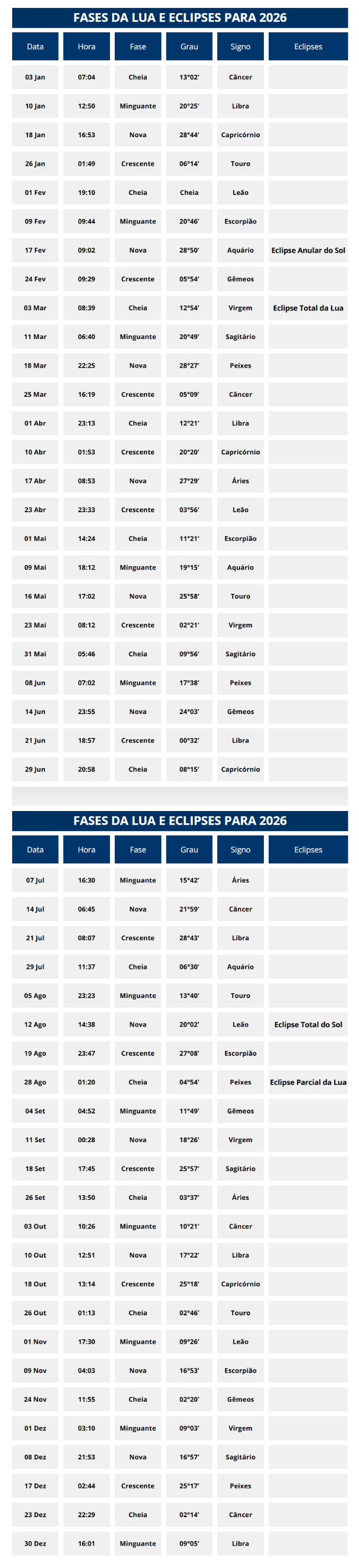 Data | Hora | Fase | Grau | Signo | Eclipses |